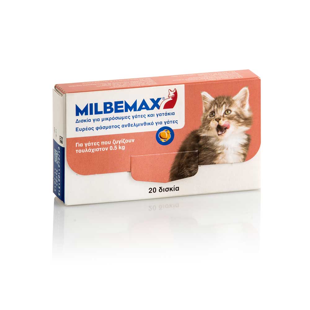 Milbemax για γάτες 0,5 – 2 kg είναι ένα φαρμακευτικό αντιπαρασιτικό δισκίο ευρέος φάσματος ειδικά σχεδιασμένο για αποπαρασίτωση γατιών και γατακιών που ζυγίζουν από 0,5 kg έως 2 kg. Περιέχει ενεργά συστατικά milbemycin oxime και praziquantel, που σκοτώνουν και ελέγχουν εντερικά παρασιτικά σκουλήκια και ταινίες και μπορεί — όταν χορηγείται κάθε μήνα — να βοηθήσει και στην πρόληψη της διροφιλαρίωσης (heartworm